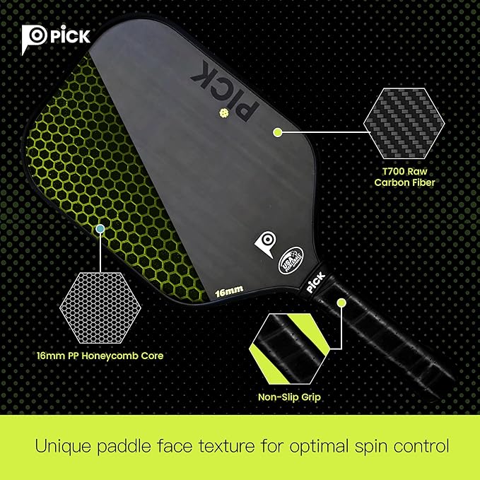 T700 Raw Carbon Fiber Surface, 16mm Polypropylene Honeycomb Core, USA Pickleball Approved